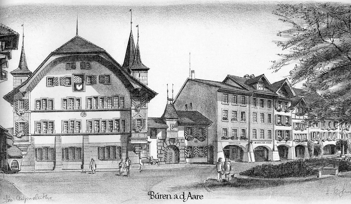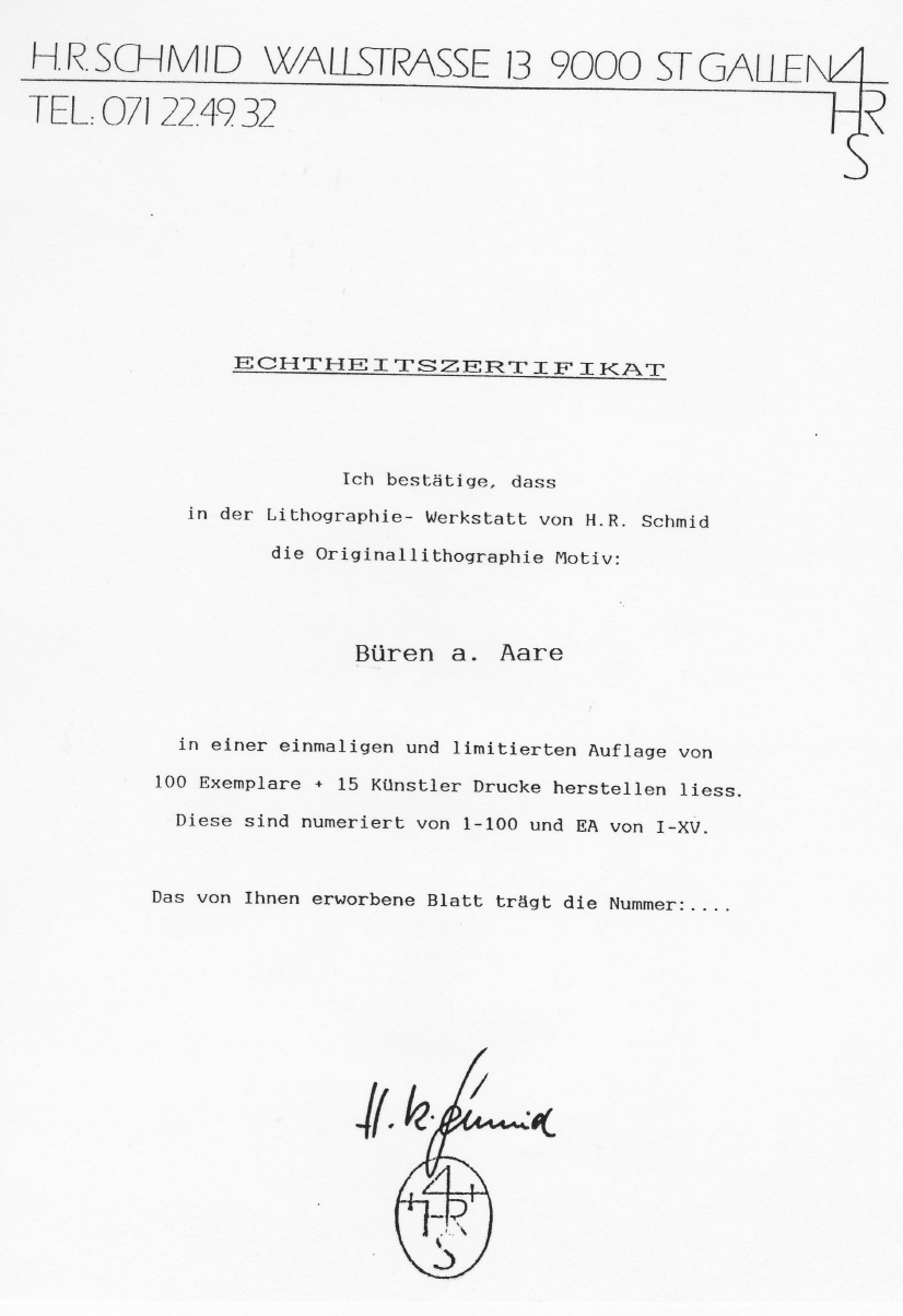 Büren a. Aare Originallitho H.R. Schmid Druck ca. 38 x 21 cm 32/100 - 36/100 -38/100 - 43/100 45/100 - 56/100 -64/100_71/100_72/100 mit Zertifikat sFr. 35.00