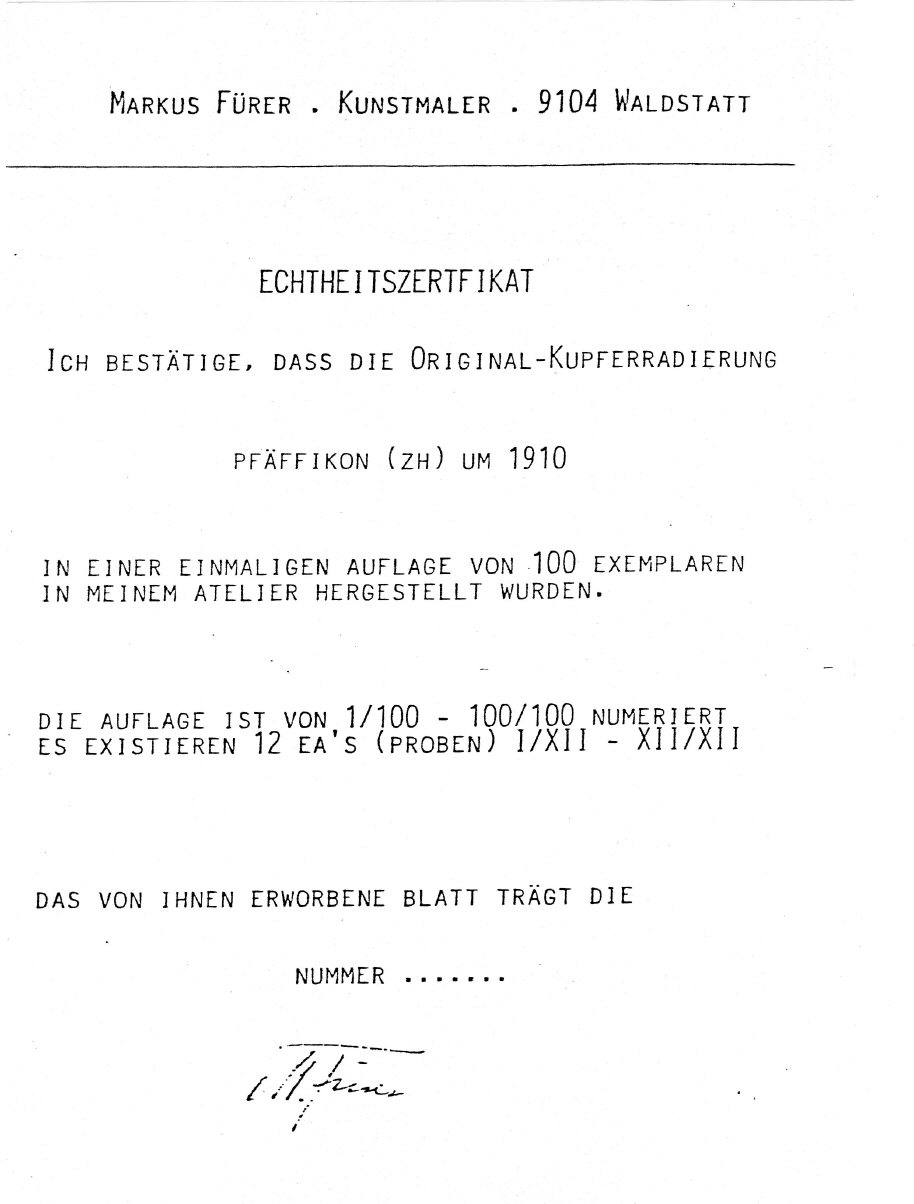 Pfäffikon ZH um 1910 Markus Fürer Druck ca. 20 x 14 cm EA I/XII 64/100, 67/100 - 68/100 84/100, 87/100 - 100 mit Zertifikat à sFr. 35.00