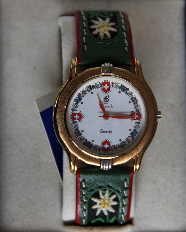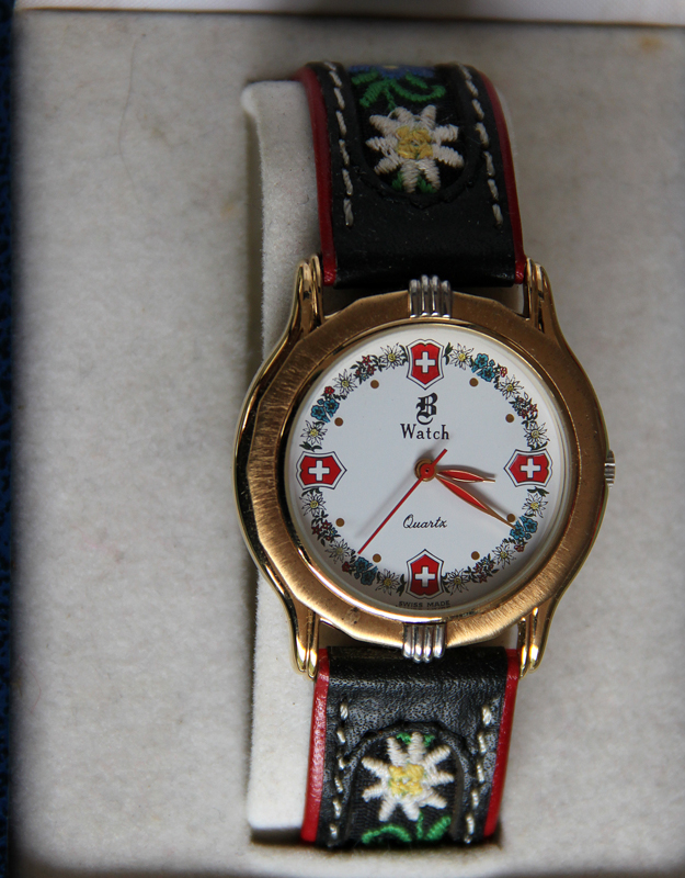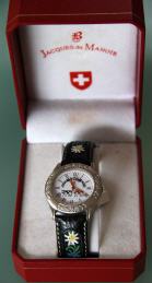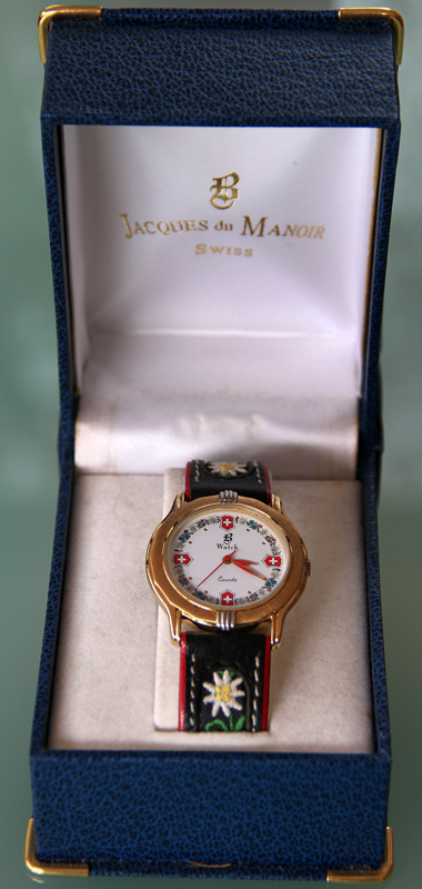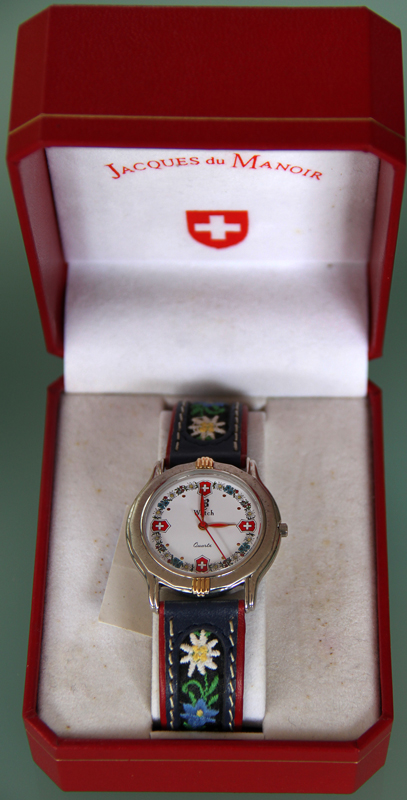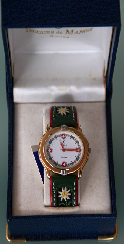 Armbanduhr Jacques du Manoir Schweiz mit Kuh-Sekungenzeiger goldfarbig mit schwarzem Band blumengemustert ungebraucht aber Batterie muss ersetzt werden CHF 48.--