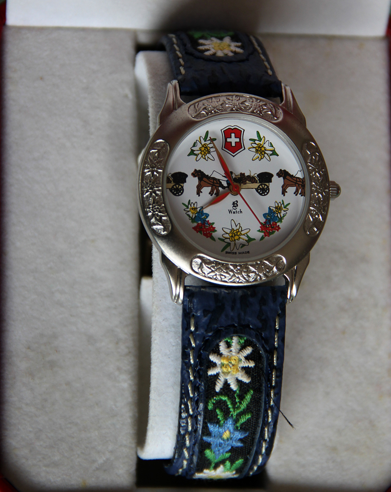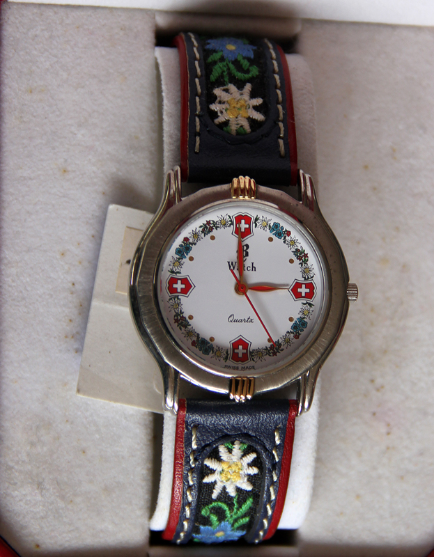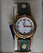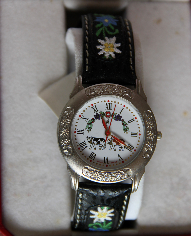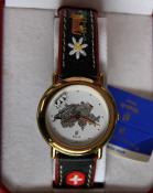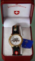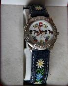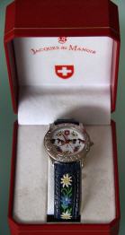 Armbanduhr Jacques du Manoir mit Kühen silberfarbig mit schwarzem Band blumengemustert ungebraucht aber Batterie muss ersetzt werden CHF 48.--