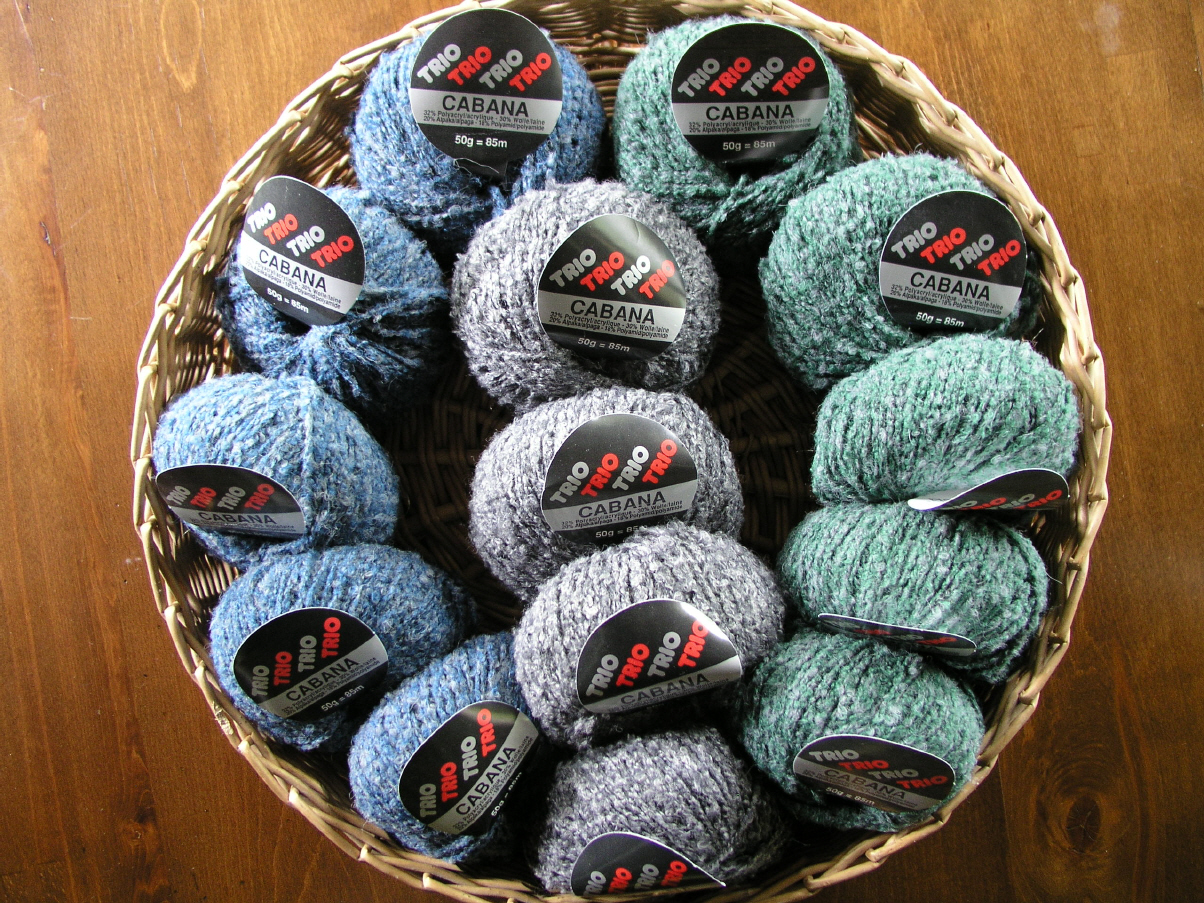 Trio Cabana 32 % Polyacryl, 30 % Wolle, 20 % Alpaka, 18 % Polyamid 50 g = 85 m, Nd. 5 – 6, Gr. 40 = 500 g 20 Kn. Grau, 15 Kn. Blau, 11 Kn. Grün