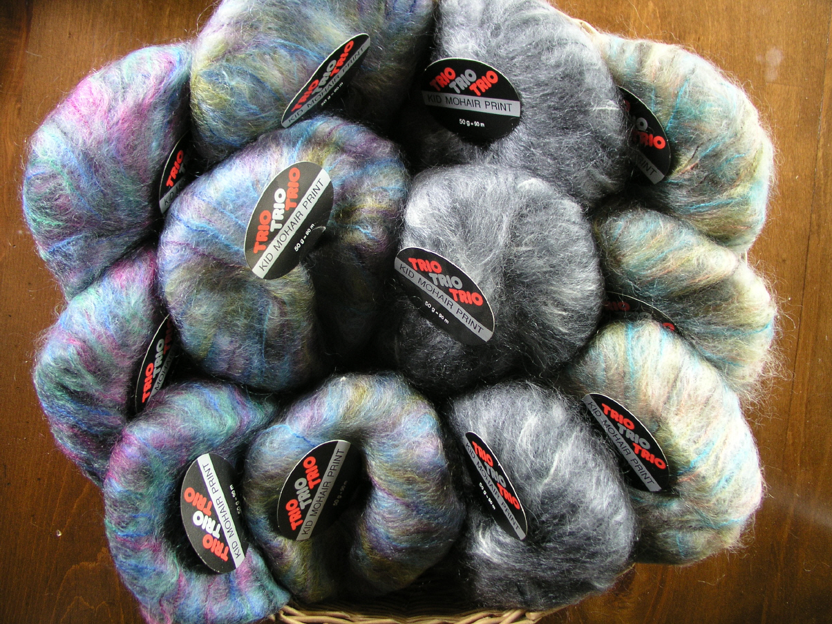Trio Kid Mohair Print 73% Mohair, 22%Wolle, 5% Nylon 50 g = 90 m, Nd. 6 – 7, Gr. 40 = 400 g je 10 Kn. 4 Farben meliert, s. Bild