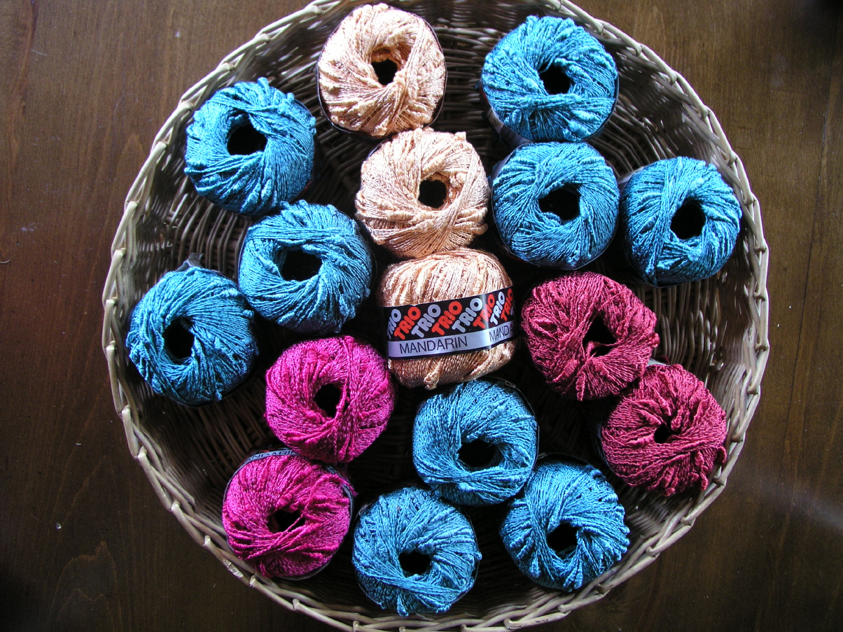 Trio Mandarin 81% Viscose, 19% Baumwolle 50 g = 90 m. Nd. 3,5 – 4,5, Gr. 40 = 600 g 9 Kn. Petrol, 10 Kn. Abricot, 7 Kn. Rot, 6 Kn. Pink